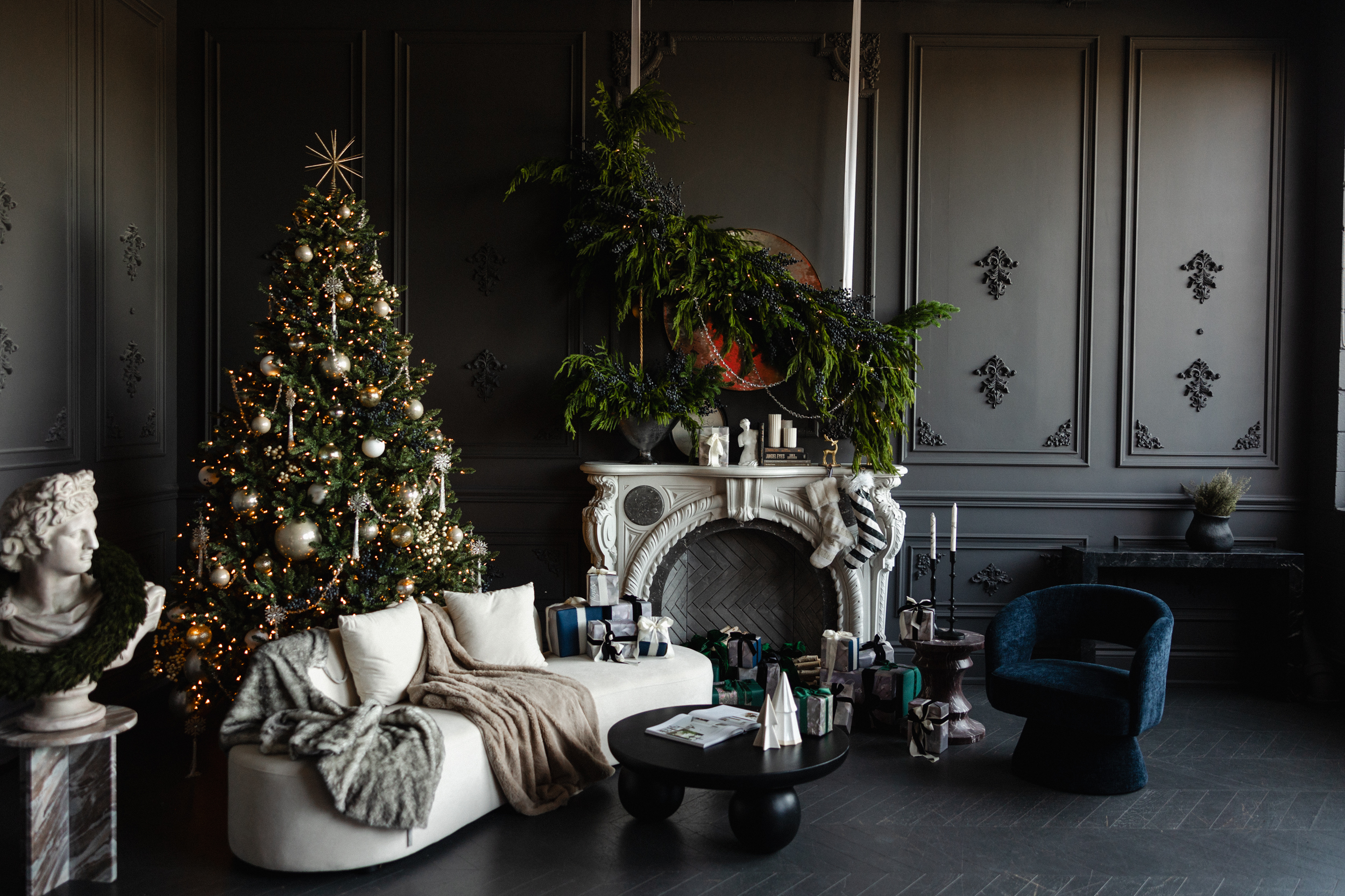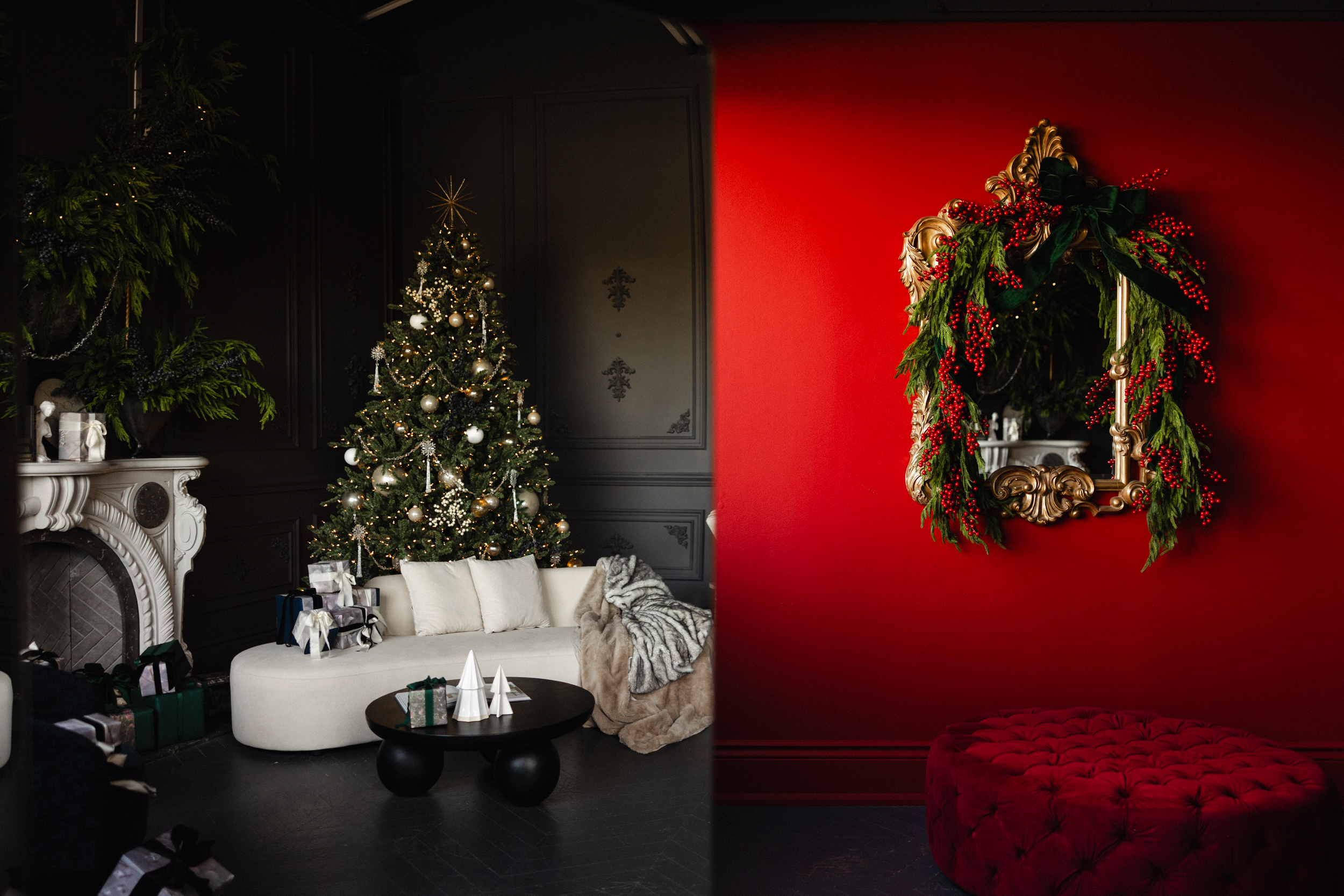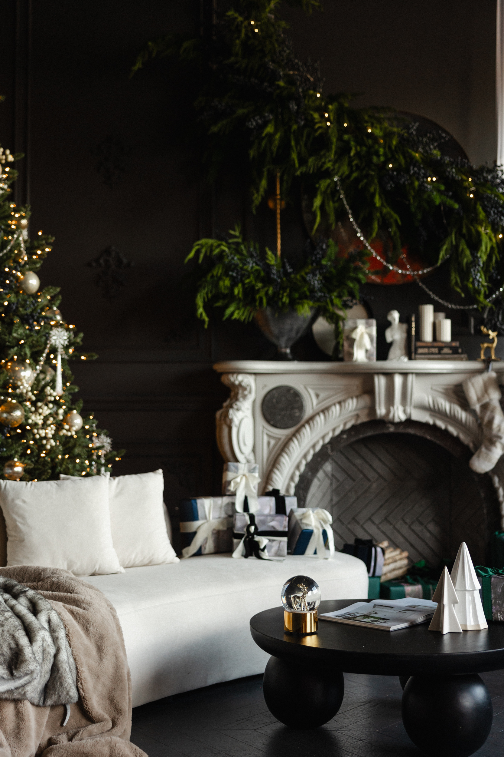 This moodboard channels a quiet luxury holiday aesthetic — timeless, polished, and deeply atmospheric. The space is anchored in elegant contrast, where dark, moody walls meet glowing festive accents. A white statement fireplace and a sculptural white couch act as grounding focal points, brightening the room and creating a sense of balance and refinement. These elements don’t just lighten the visual weight — they elevate the entire space, allowing the darker backdrop to feel curated, not heavy.