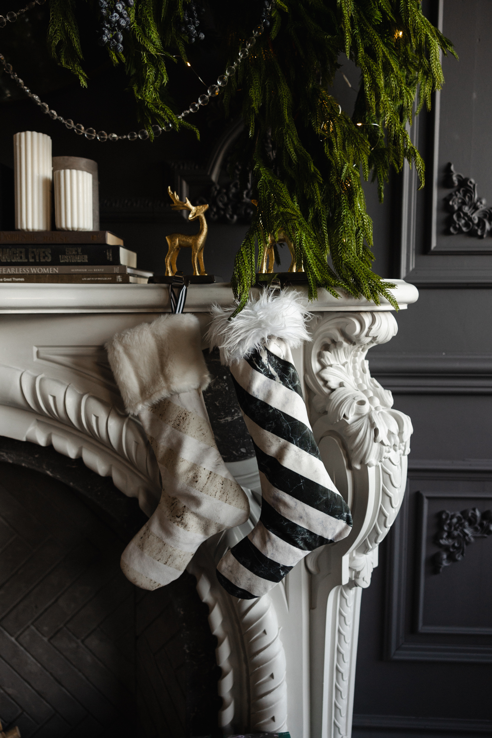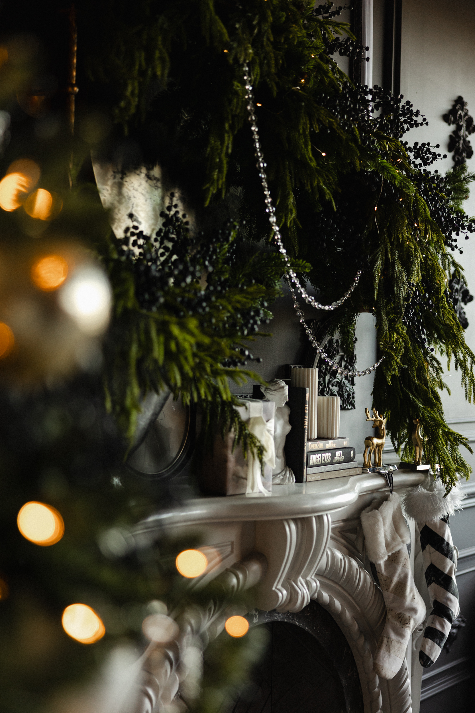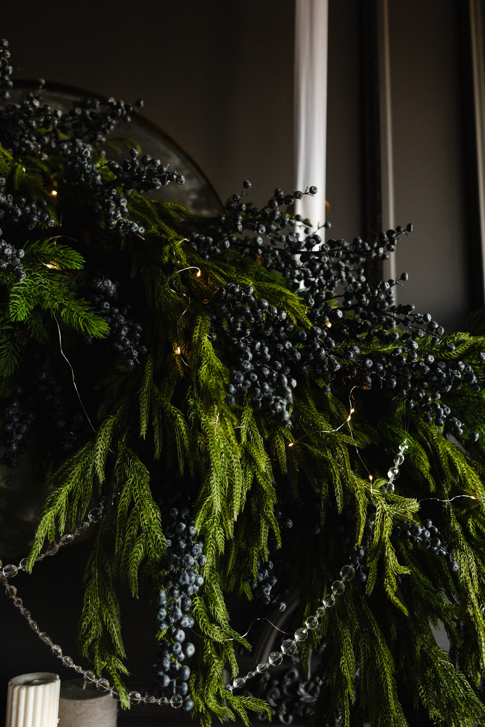 This moodboard channels a quiet luxury holiday aesthetic — timeless, polished, and deeply atmospheric. The space is anchored in elegant contrast, where dark, moody walls meet glowing festive accents. A white statement fireplace and a sculptural white couch act as grounding focal points, brightening the room and creating a sense of balance and refinement. These elements don’t just lighten the visual weight — they elevate the entire space, allowing the darker backdrop to feel curated, not heavy.