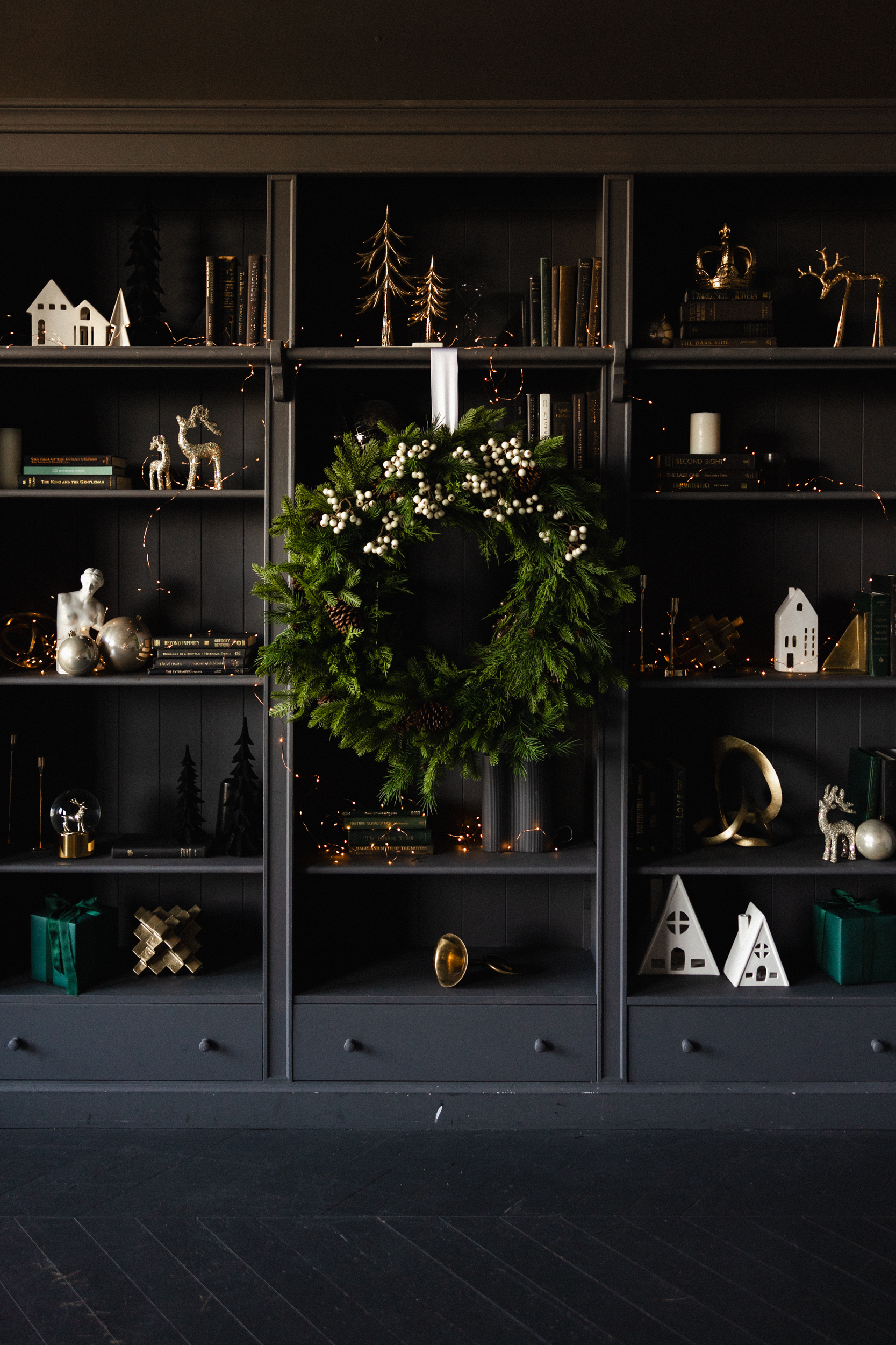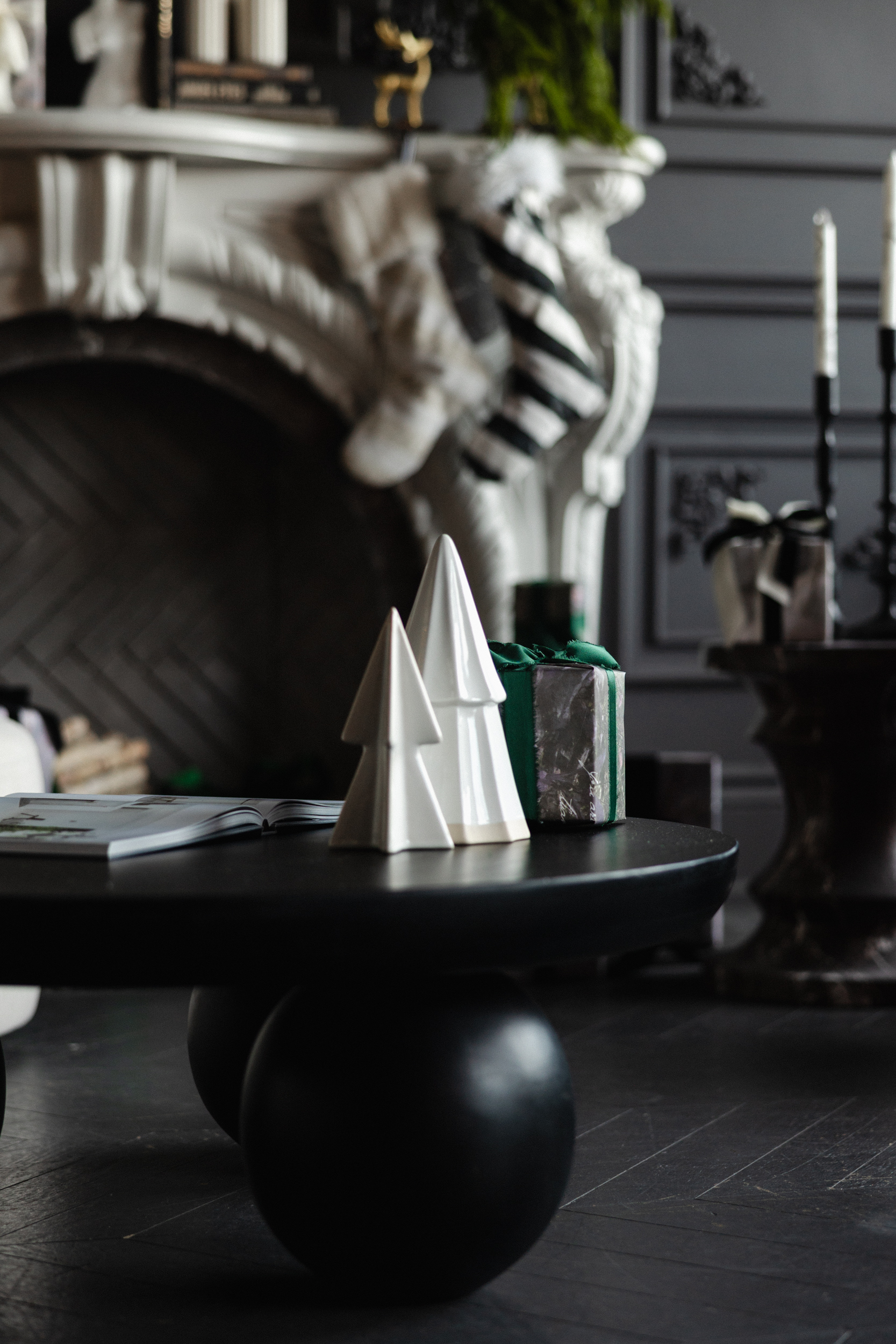 Ornaments in shimmering whites, golds, and luminous metallics are carefully chosen to thread harmony between the rich black walls and the soft white finishes, creating a look that is both festive and restrained. Their subtle shine adds a touch of celebratory sparkle without overwhelming the room’s quiet sophistication.