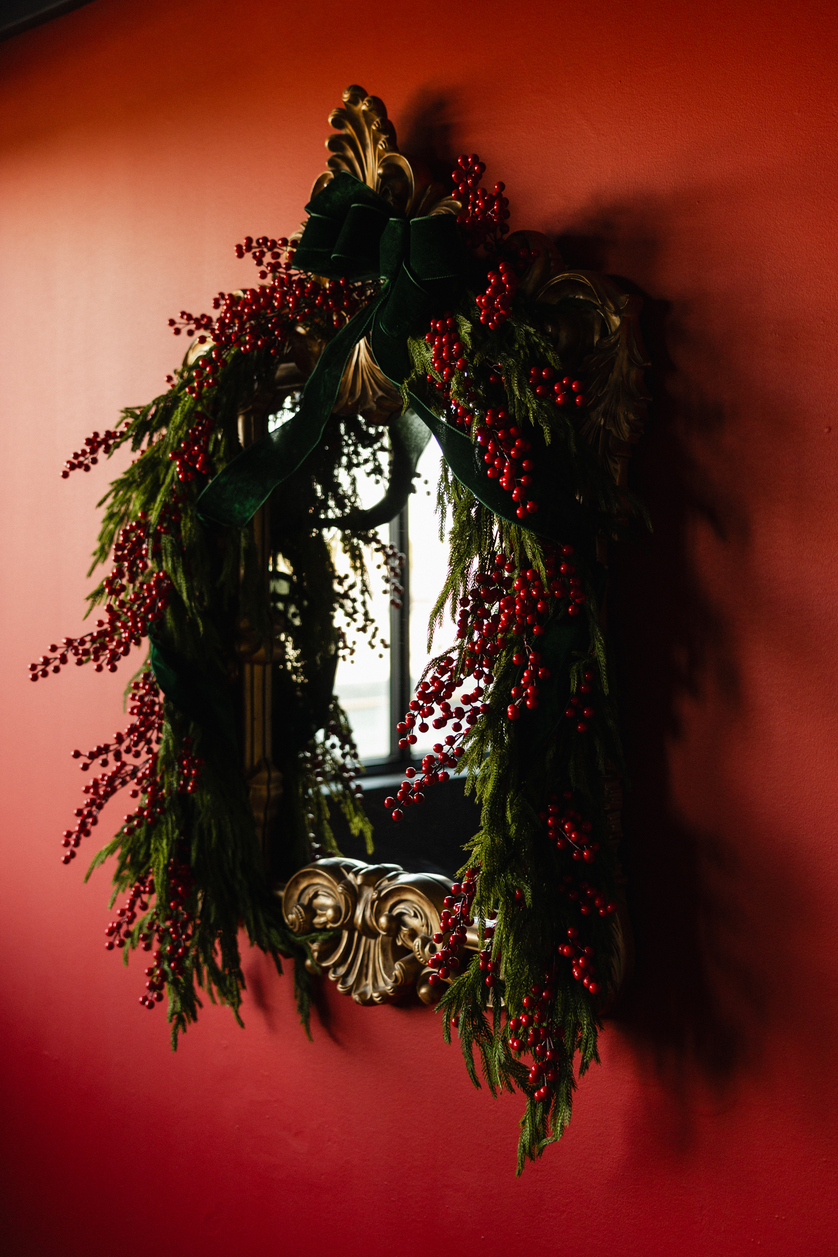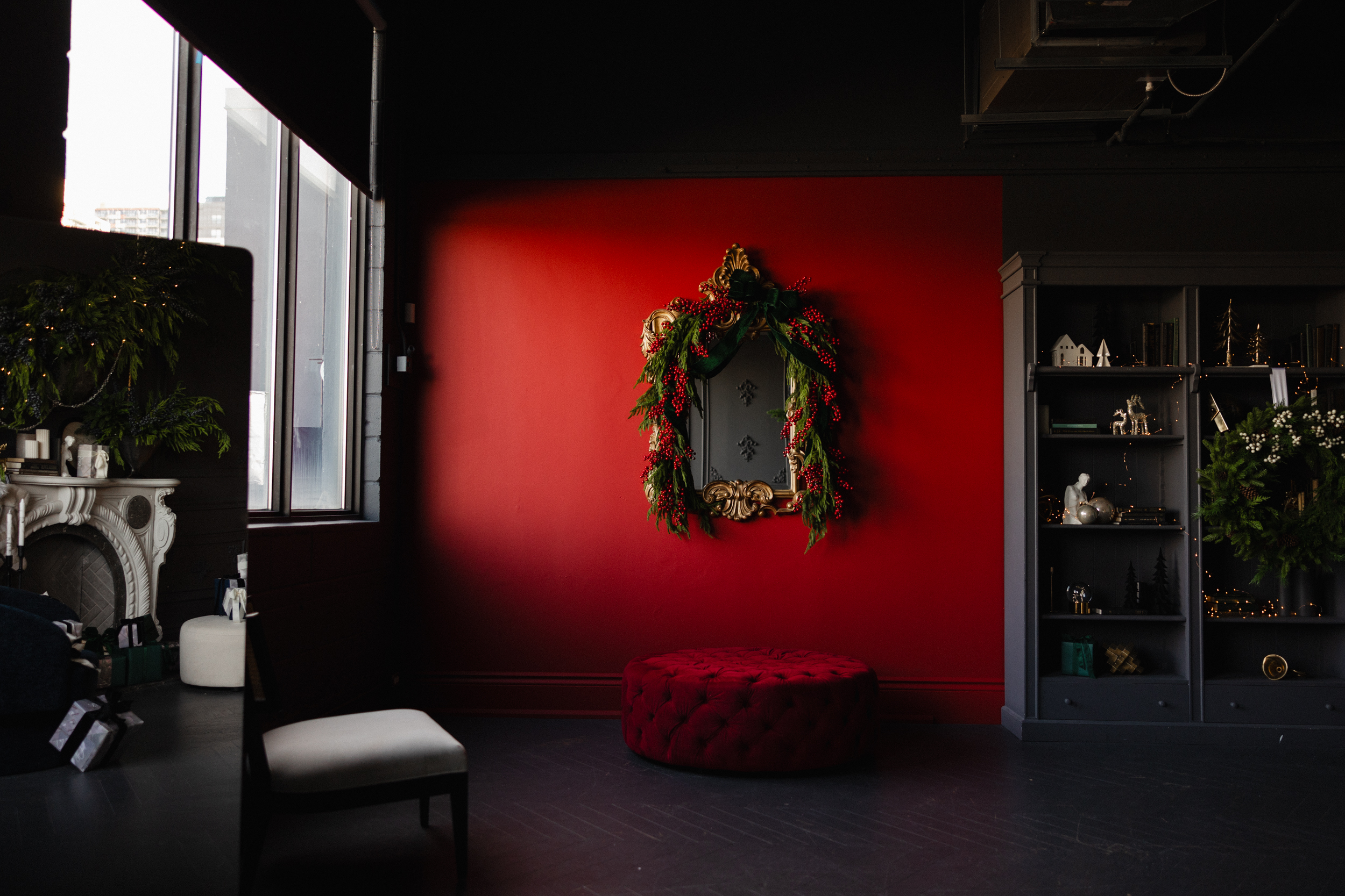 On one side, the bookshelf-adjacent wall will be painted in a deep red, offering a rich, editorial-style accent for photos. This deliberate color addition introduces warmth and visual interest, while remaining true to the overall palette. The result is a space that feels curated and composed, offering variety for imagery — from dark elegance to modern festivity, all within one room.