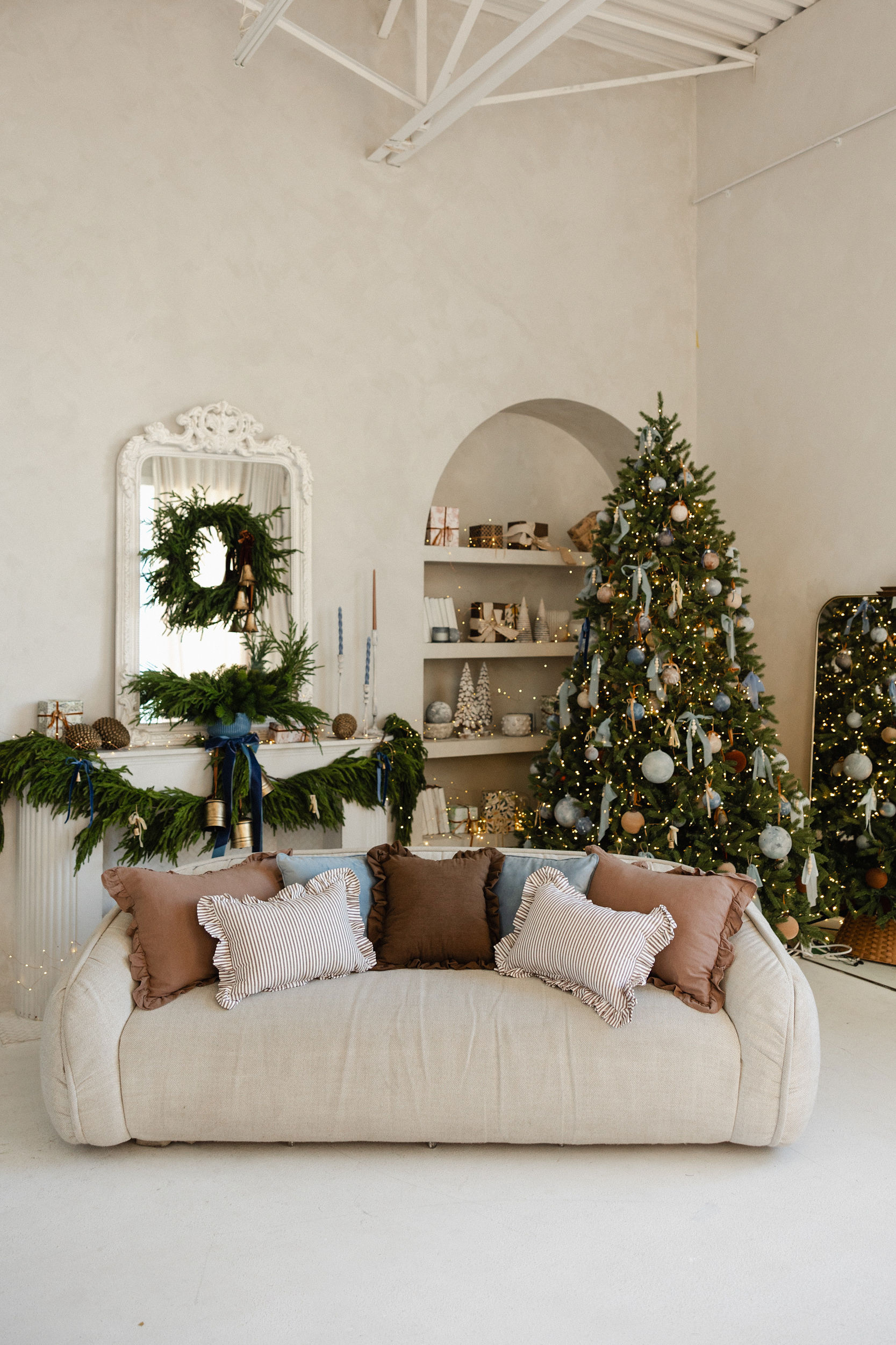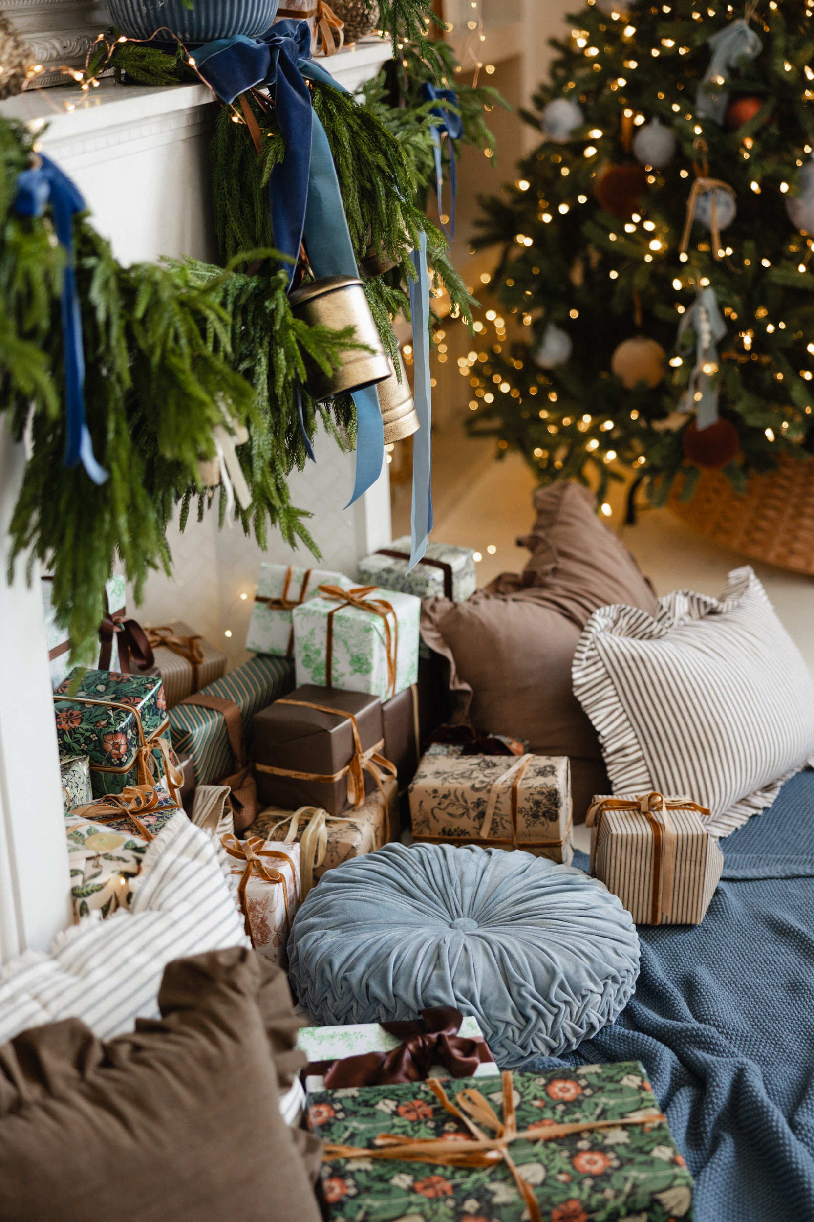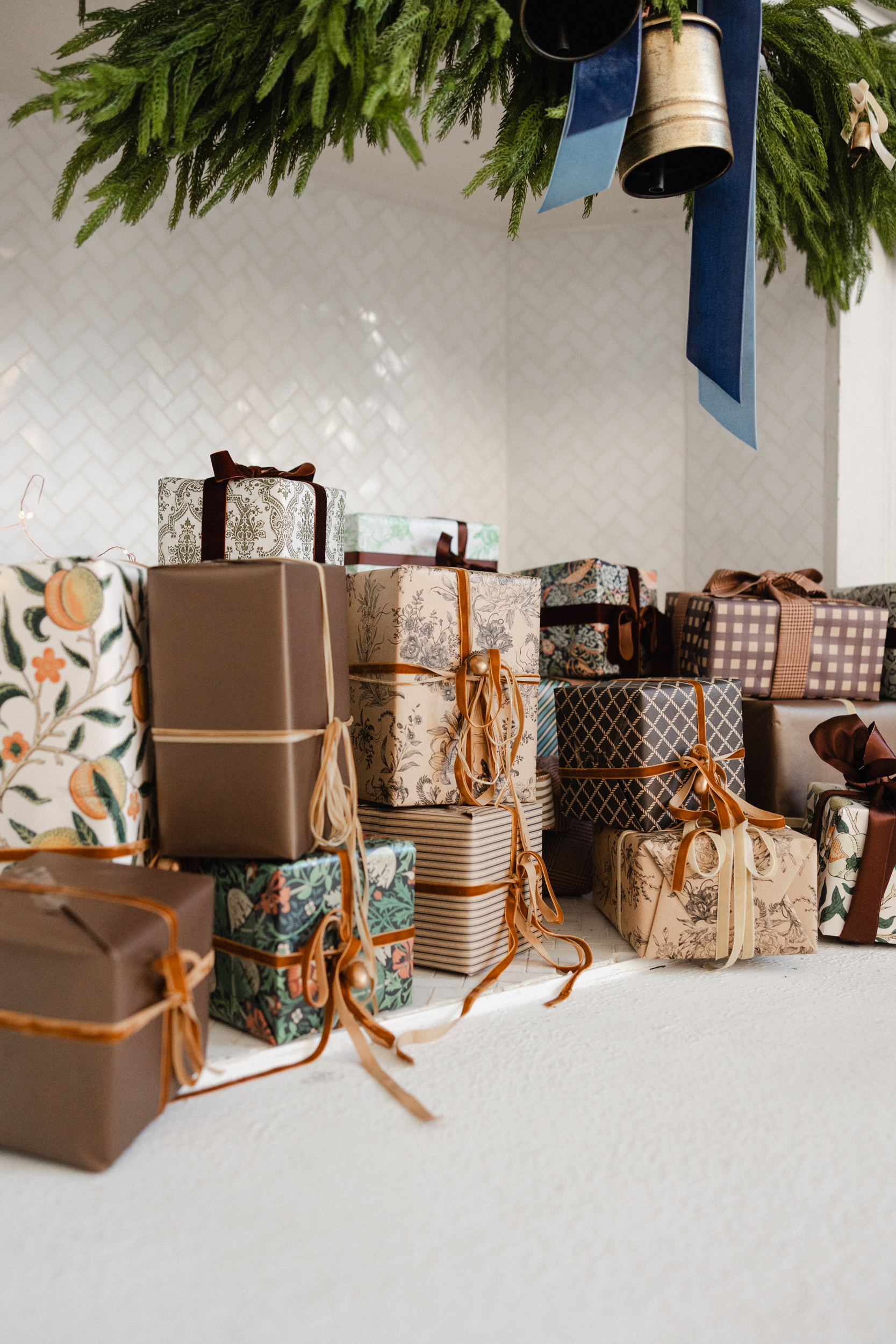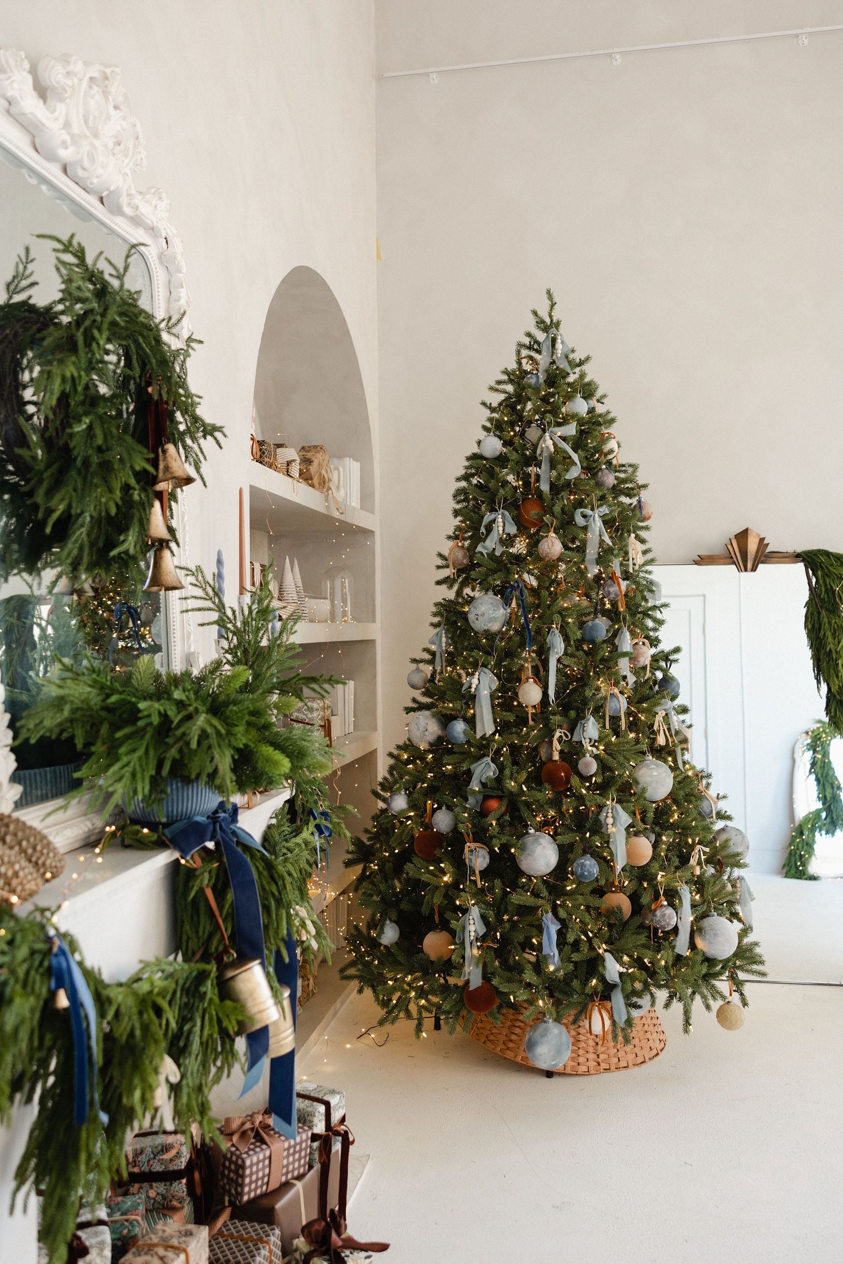 A quiet ode to warmth and refinement, this setup invites you into our Salon Studio with sculptural bells, stormy blues, velvet ribbons, and linen-wrapped gifts. A space where modern lines meet vintage textures, where beauty lingers in the details.