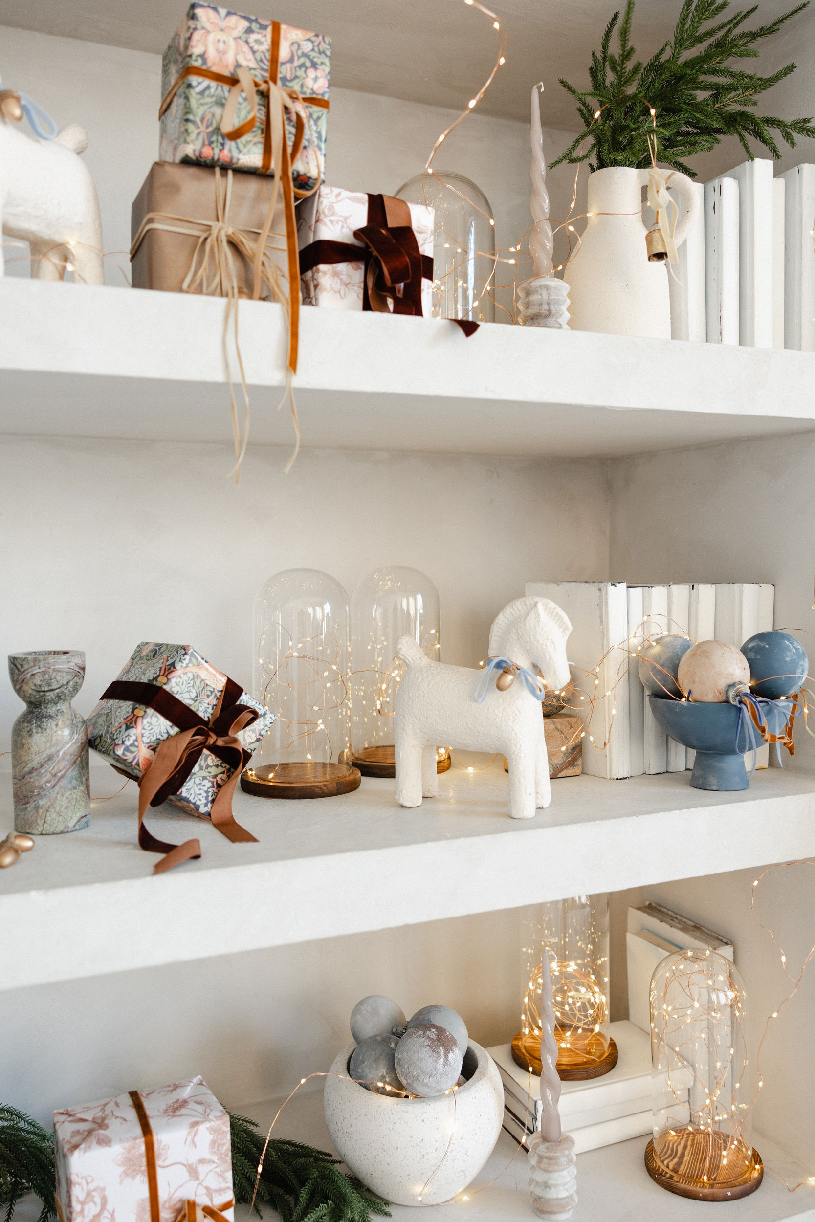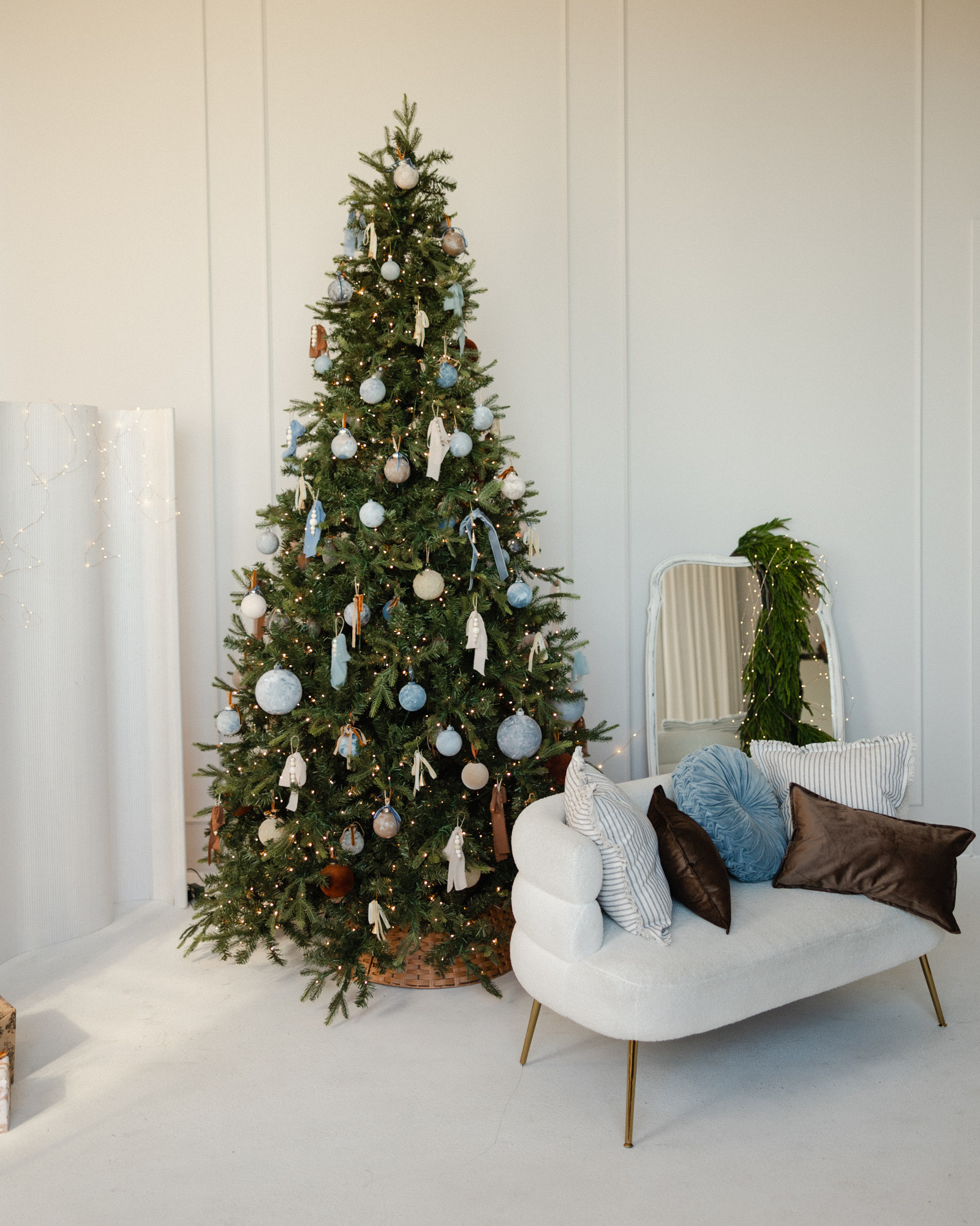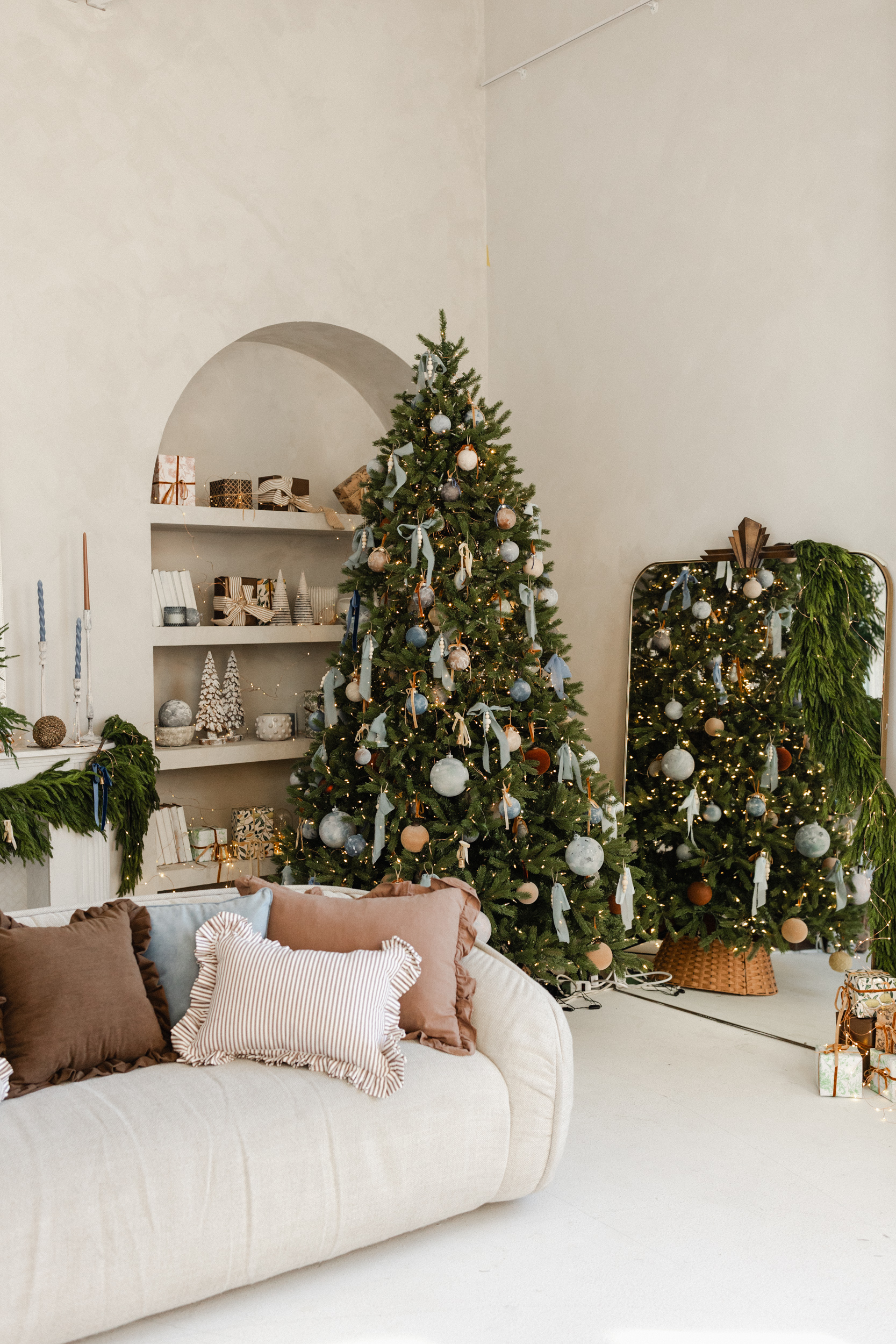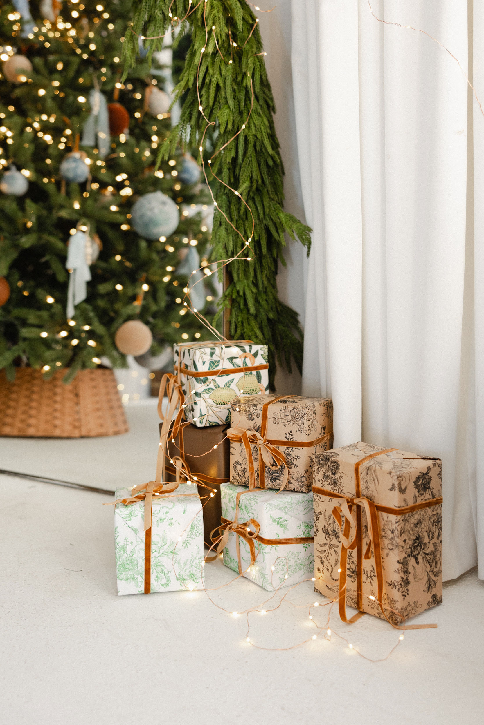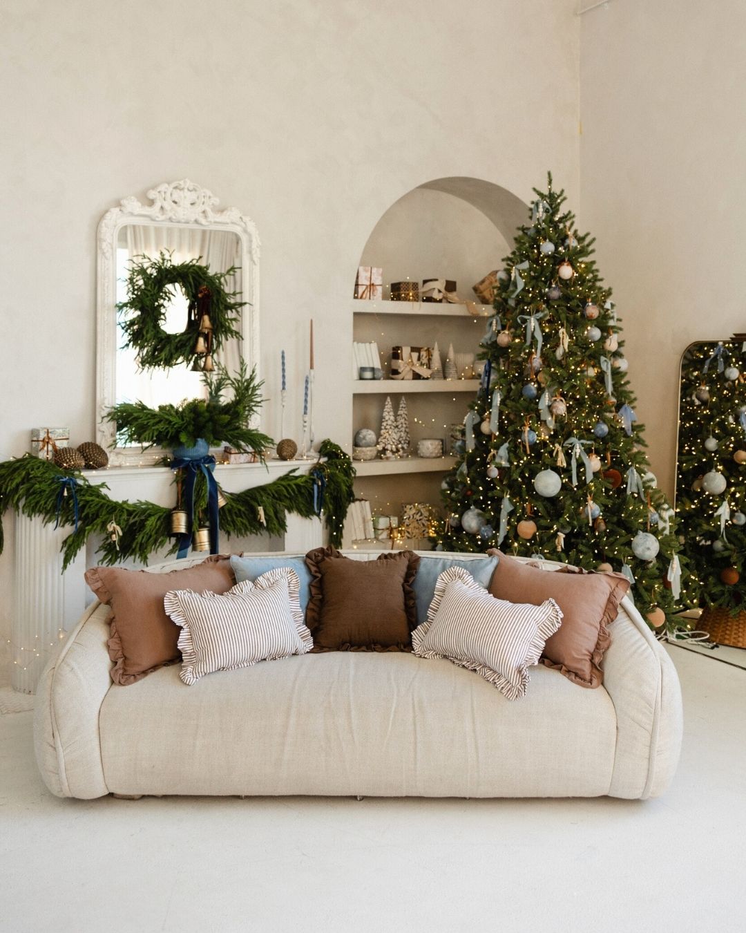 A quiet ode to warmth and refinement, this setup invites you into our Salon Studio with sculptural bells, stormy blues, velvet ribbons, and linen-wrapped gifts. A space where modern lines meet vintage textures, where beauty lingers in the details.