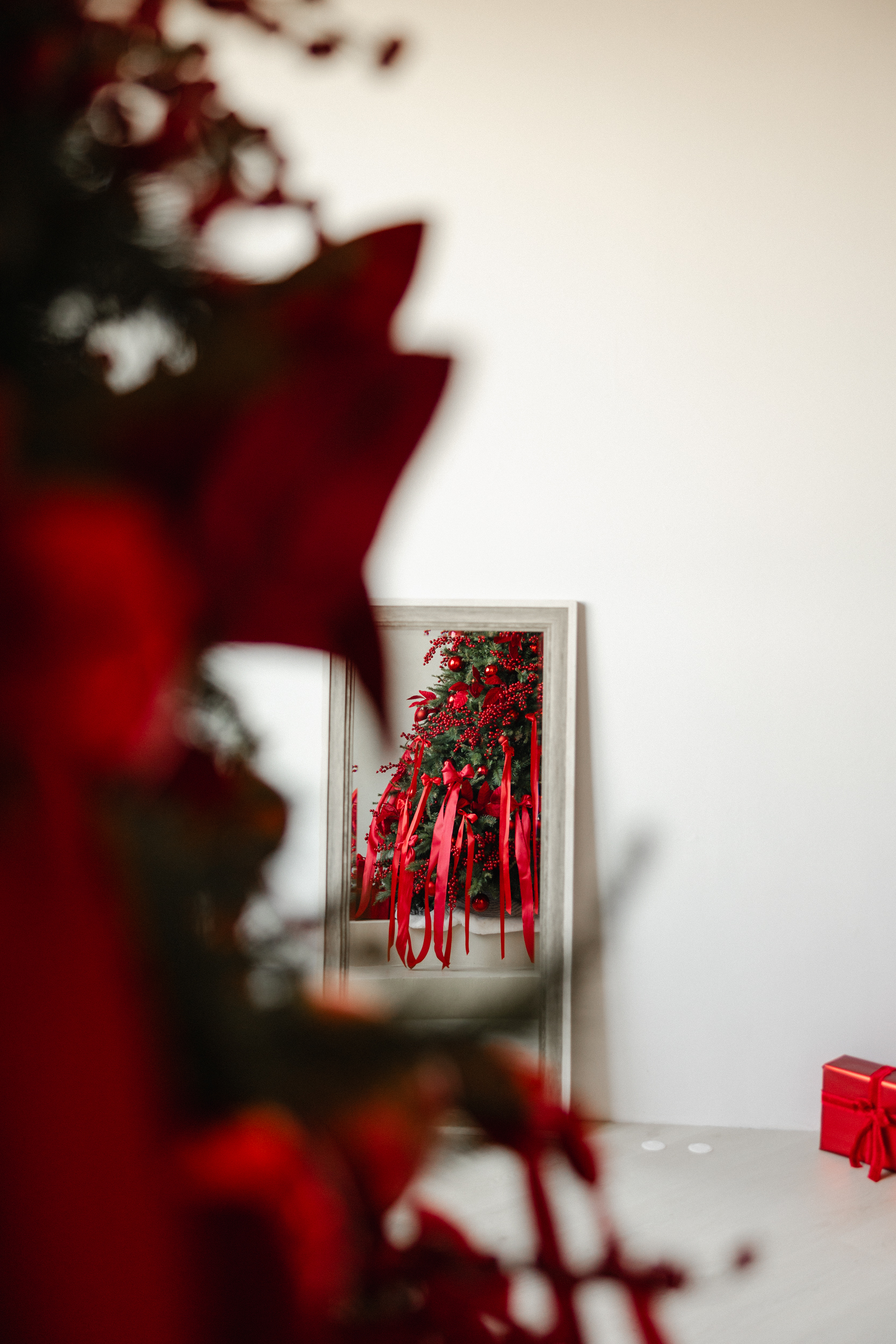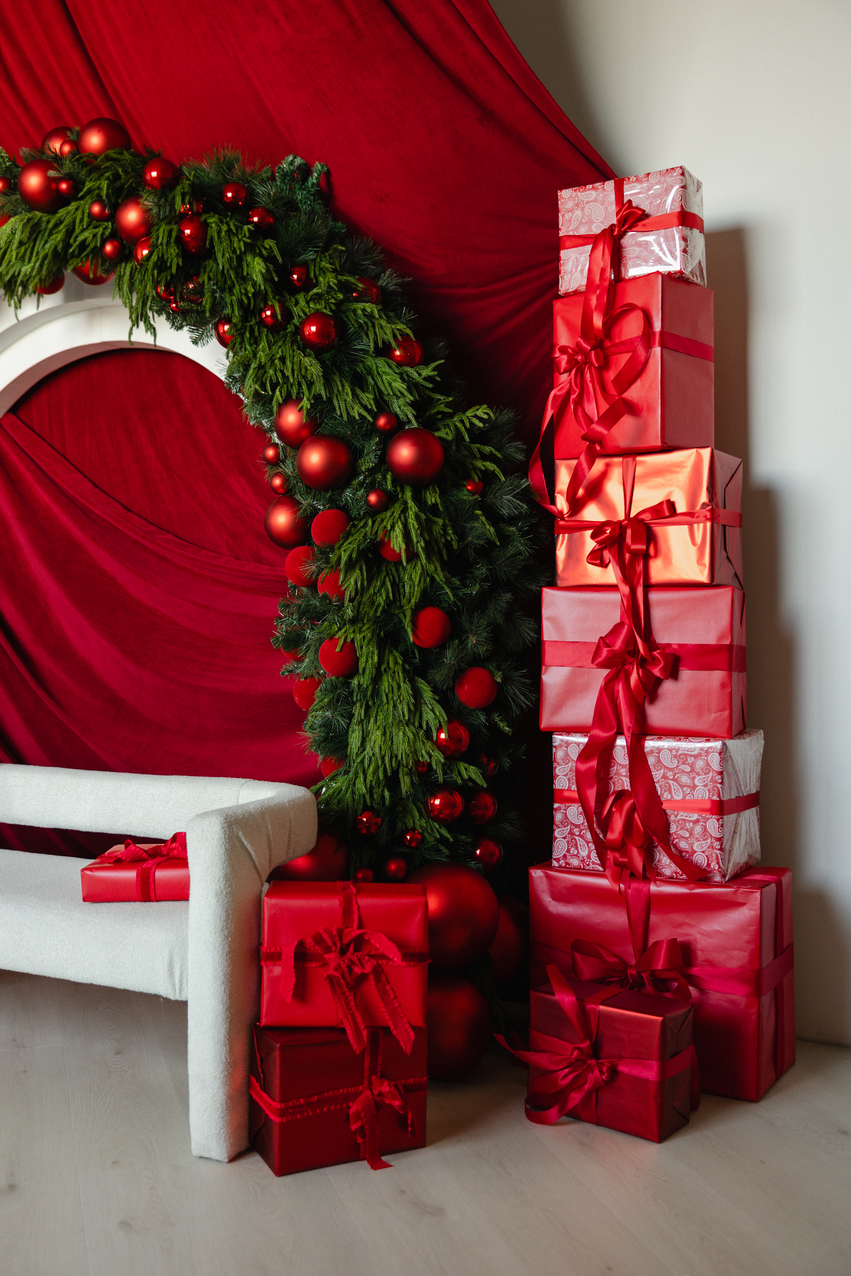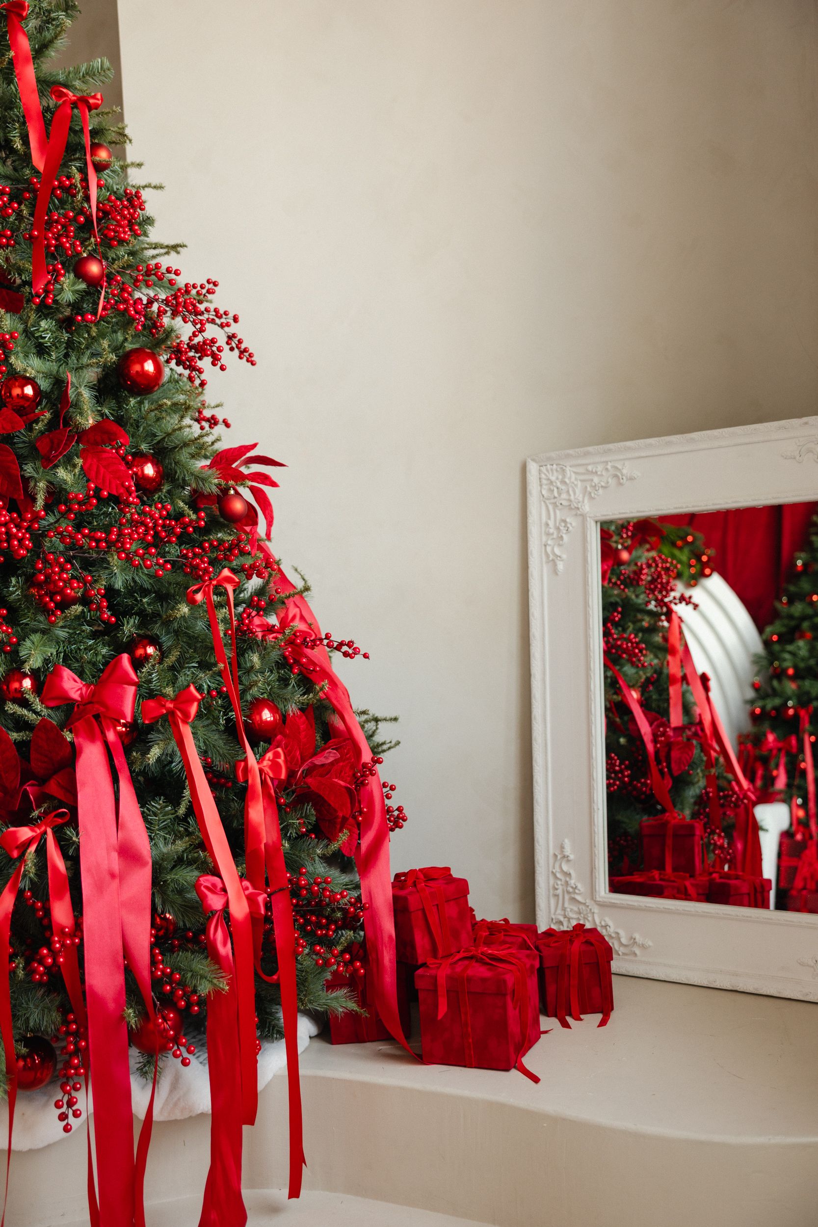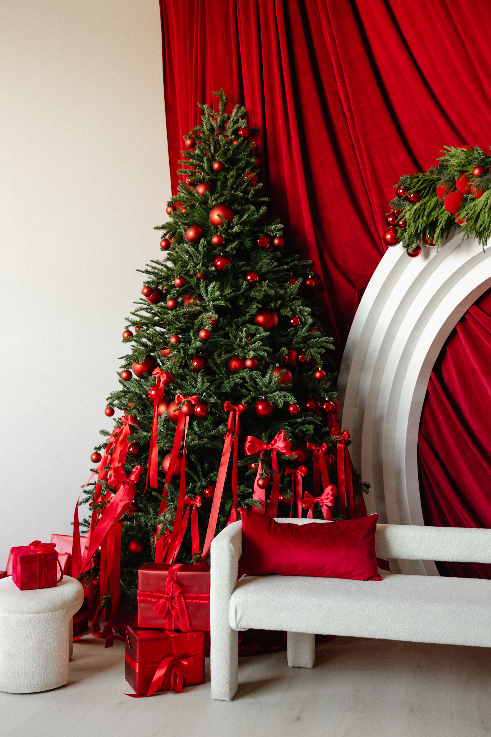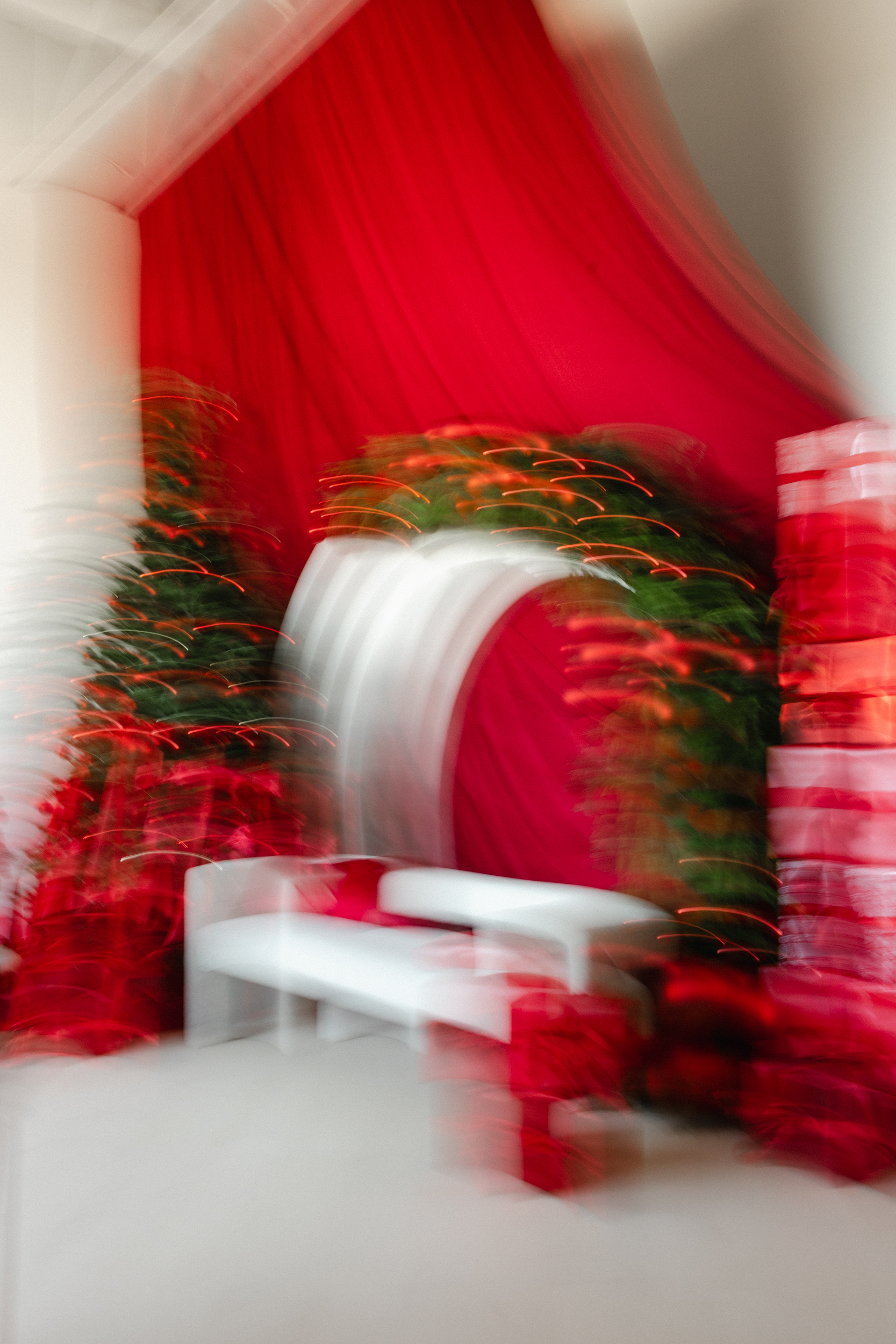 The space is anchored by dramatic garlands, oversized ornaments, and rich velvet ribbons that spiral around the trees and sweep across archways. These layered, textural elements transform the room into an elegant and festive cocoon, perfect for portraits with warmth and presence. A crisp white bench and soft architectural curves offer a serene contrast to the rich cranberry palette, enhancing the setup’s modern yet timeless aesthetic. From velvet-draped wreaths to statement florals and festive decor, every detail is layered to create a look that feels classic yet strikingly modern.