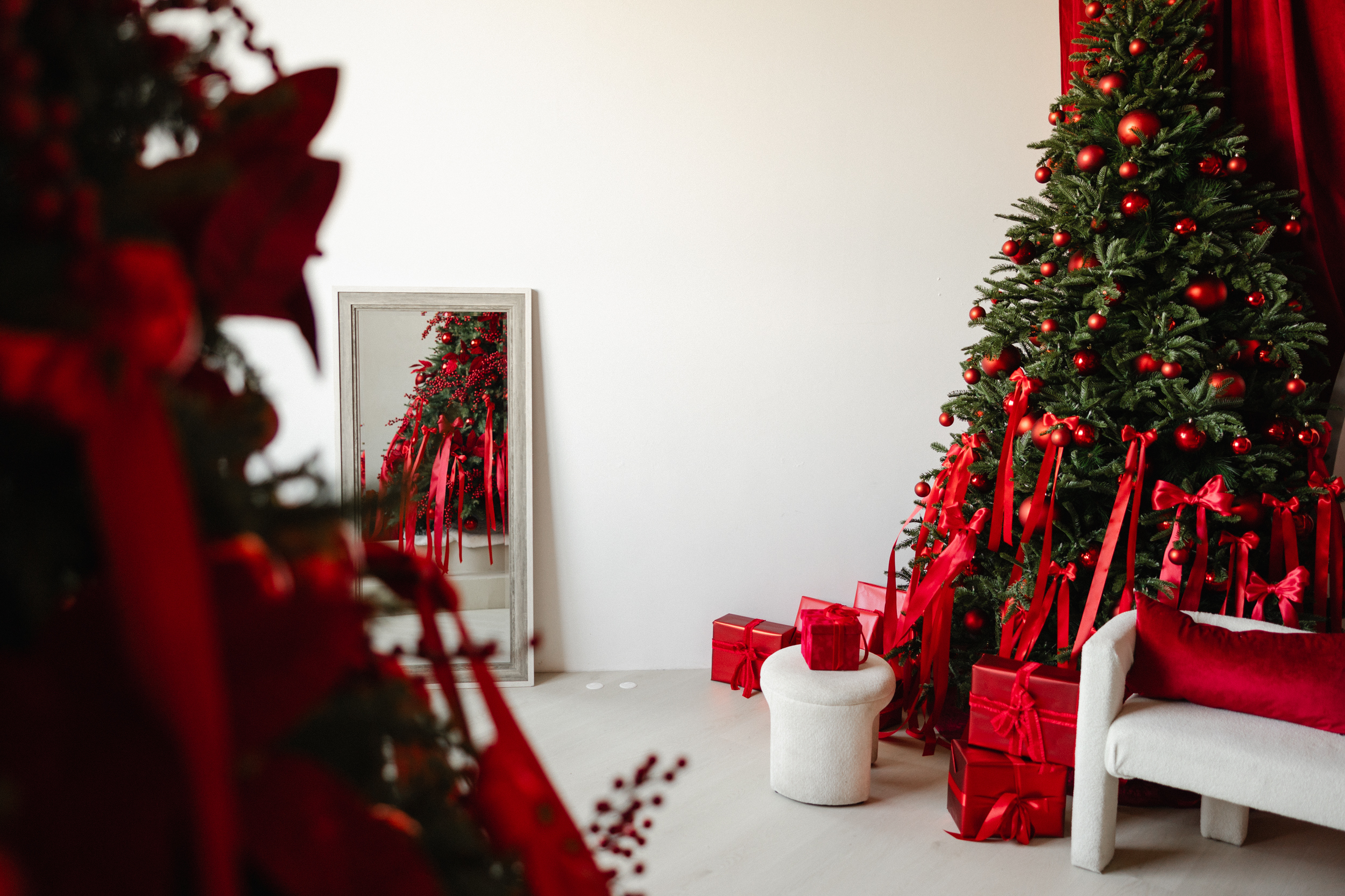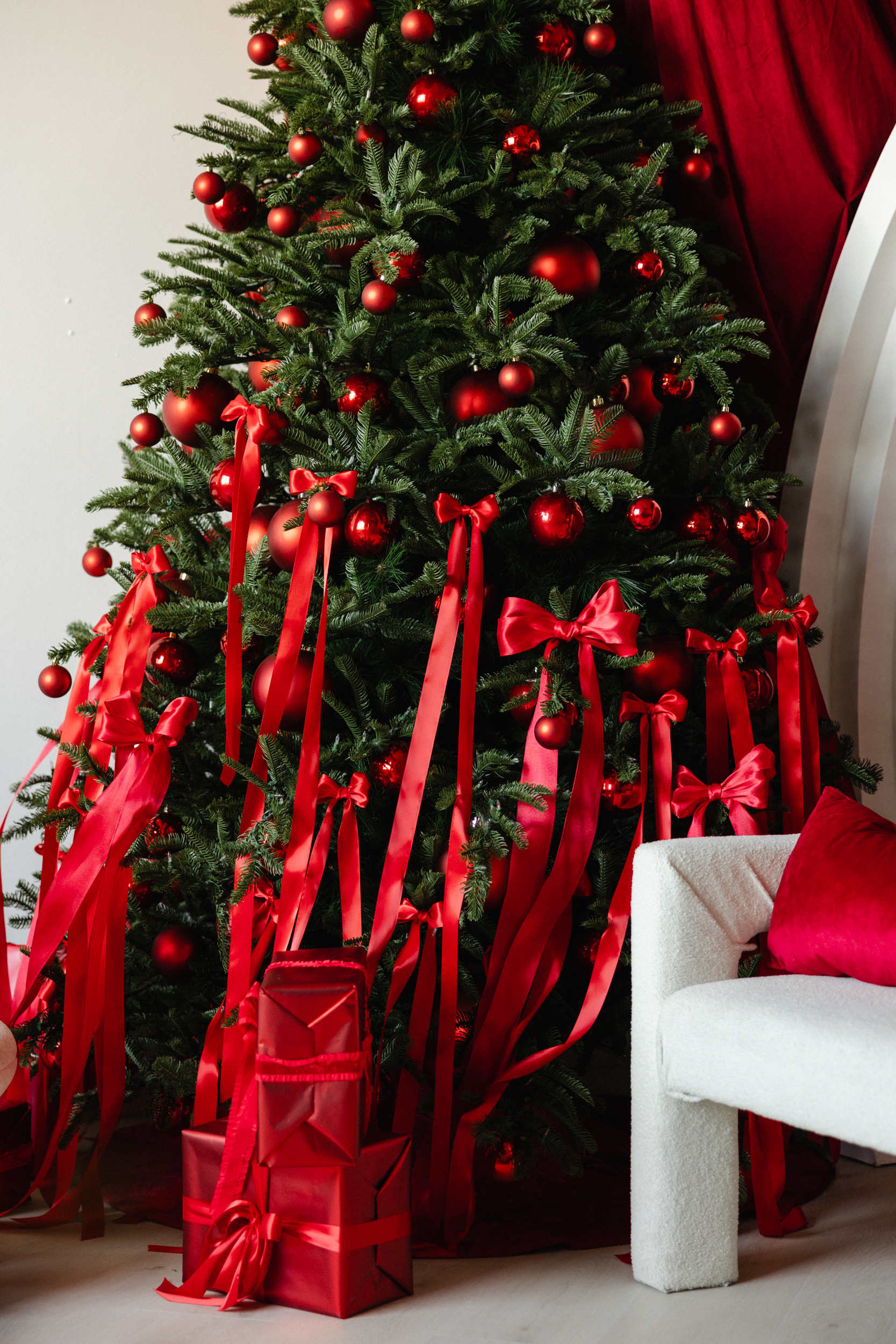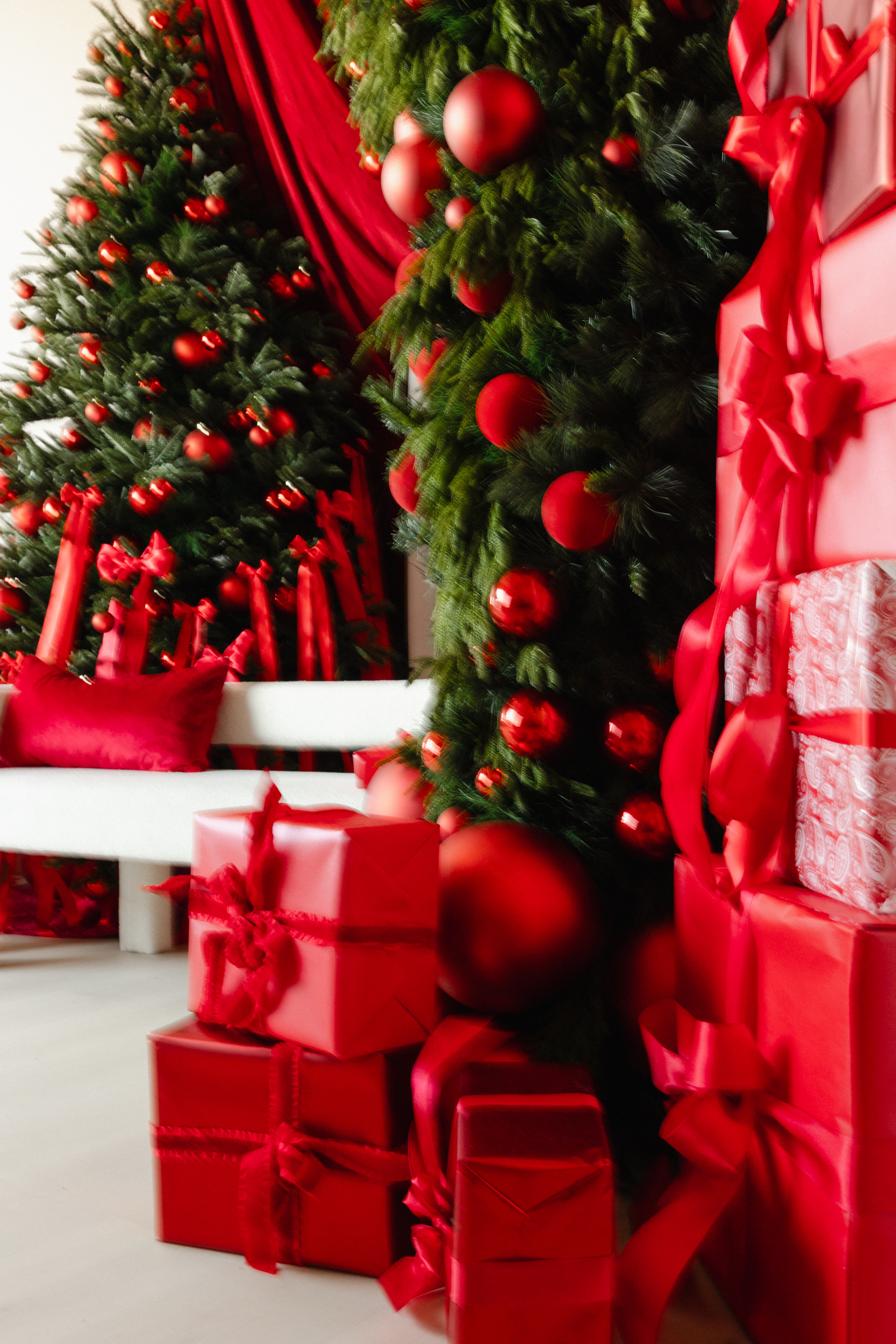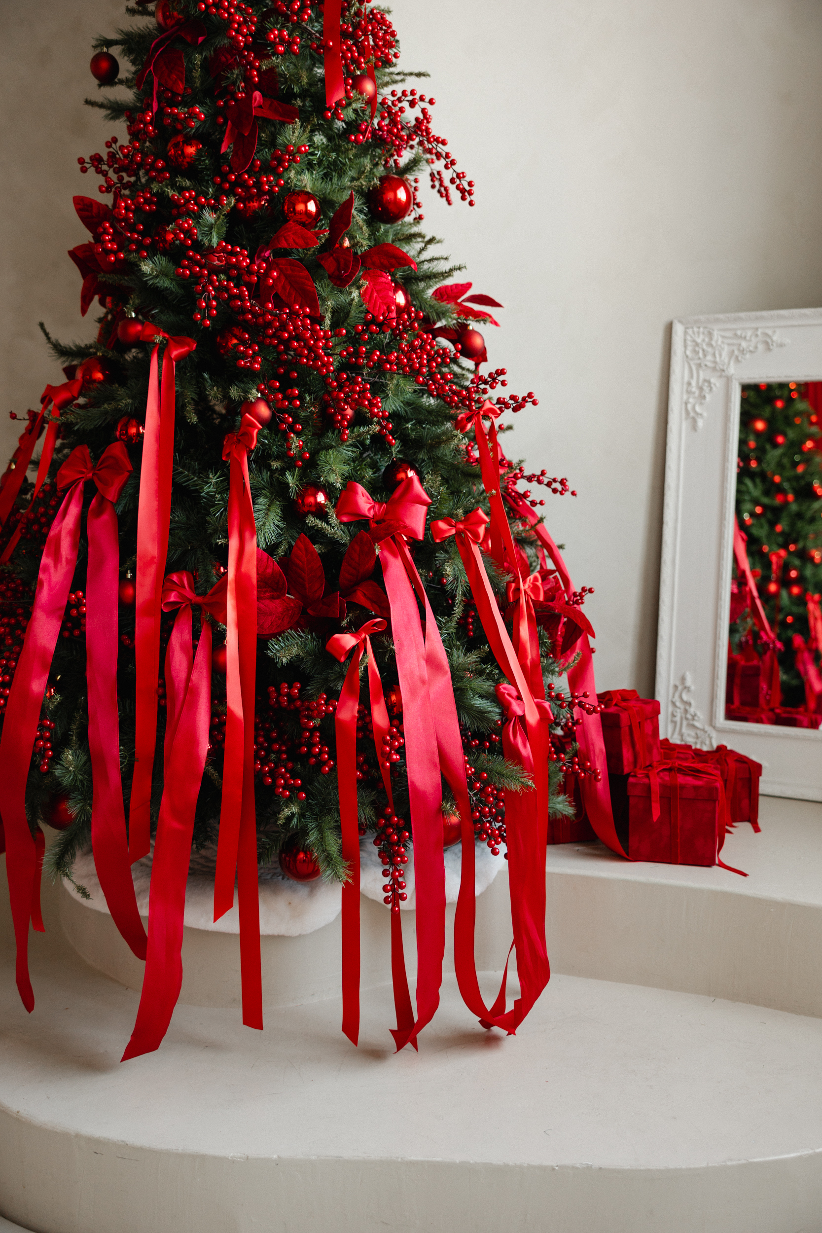 The space is anchored by dramatic garlands, oversized ornaments, and rich velvet ribbons that spiral around the trees and sweep across archways. These layered, textural elements transform the room into an elegant and festive cocoon, perfect for portraits with warmth and presence. A crisp white bench and soft architectural curves offer a serene contrast to the rich cranberry palette, enhancing the setup’s modern yet timeless aesthetic. From velvet-draped wreaths to statement florals and festive decor, every detail is layered to create a look that feels classic yet strikingly modern.
