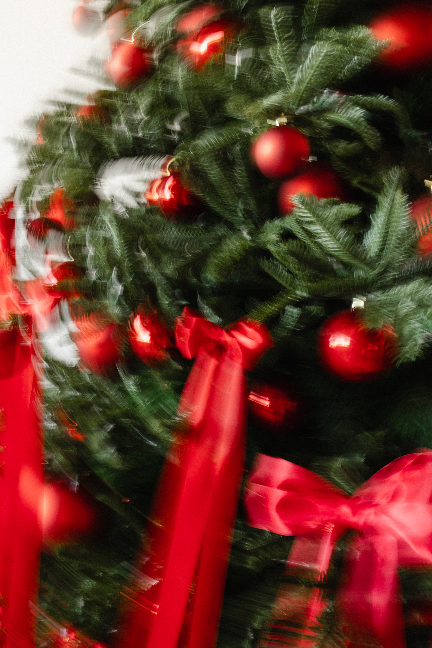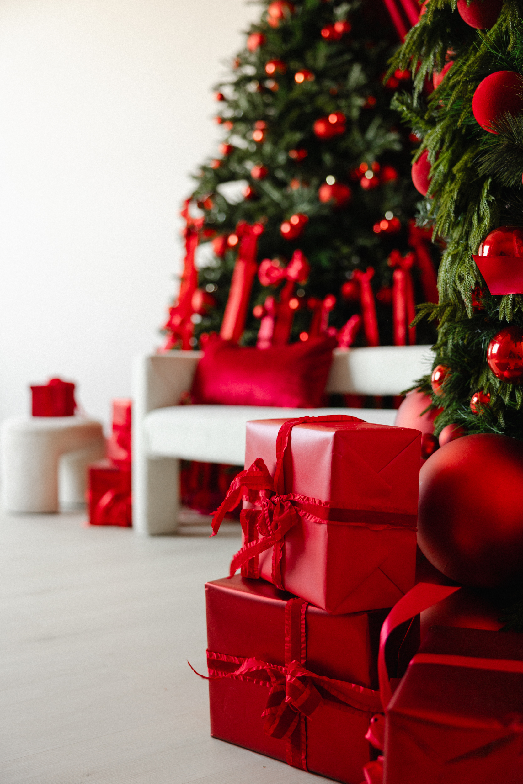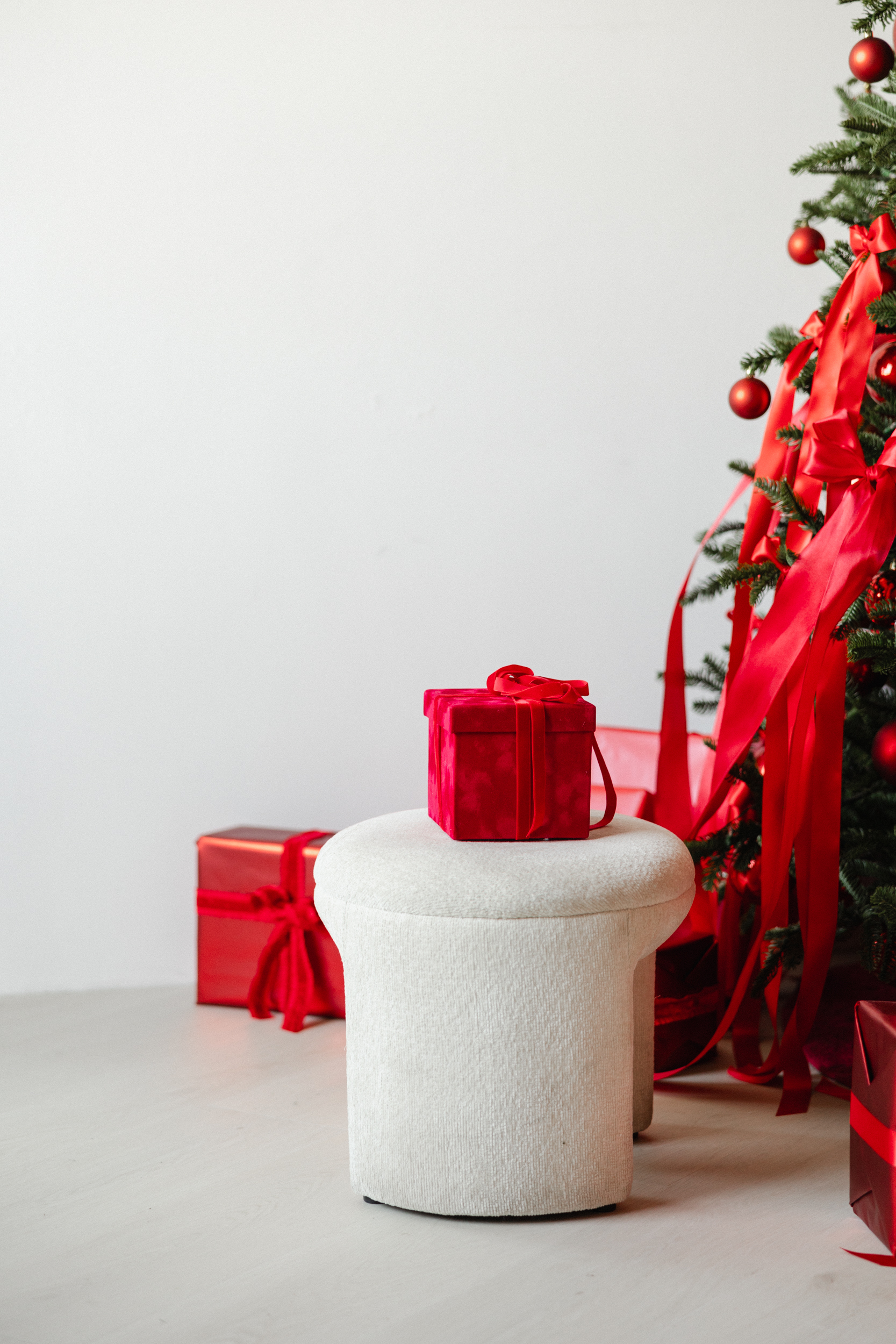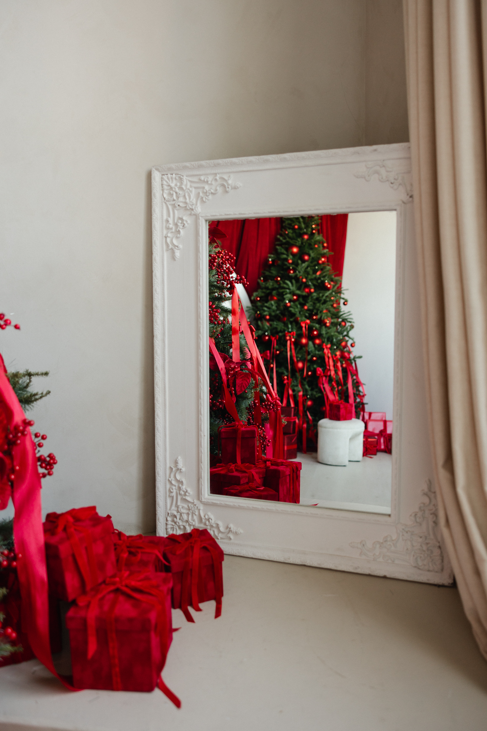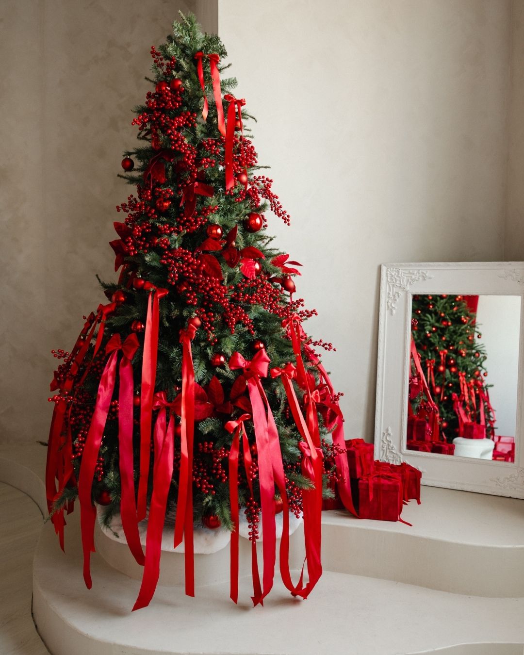 The space is anchored by dramatic garlands, oversized ornaments, and rich velvet ribbons that spiral around the trees and sweep across archways. These layered, textural elements transform the room into an elegant and festive cocoon, perfect for portraits with warmth and presence. A crisp white bench and soft architectural curves offer a serene contrast to the rich cranberry palette, enhancing the setup’s modern yet timeless aesthetic. From velvet-draped wreaths to statement florals and festive decor, every detail is layered to create a look that feels classic yet strikingly modern.