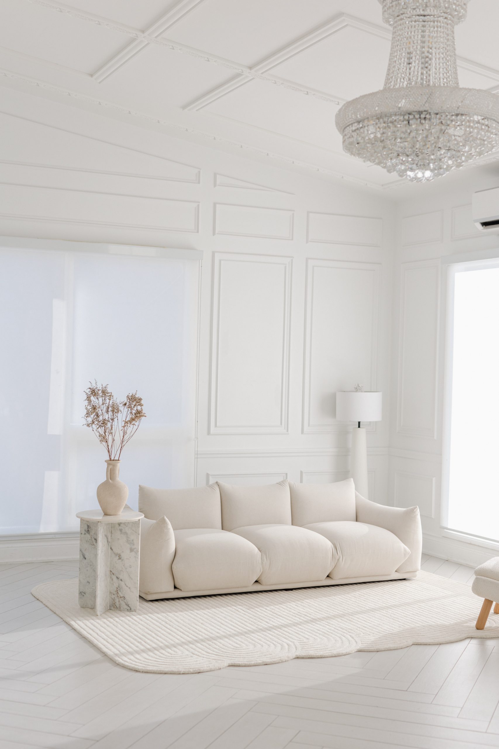 The White Loft is a bright all-white elegant rectangular corner room with three large windows facing South and East. It features a tall slanted ceiling with delicate moldings and a chandelier, accented by round crystal medallion; off-white herringbone floors with a grand European feel, elegant and modern 7 foot arch, grand arched bookshelf, geometric oversized double doors and more. This space is perfect for branding sessions, editorial shoots and elegant family portraits.
